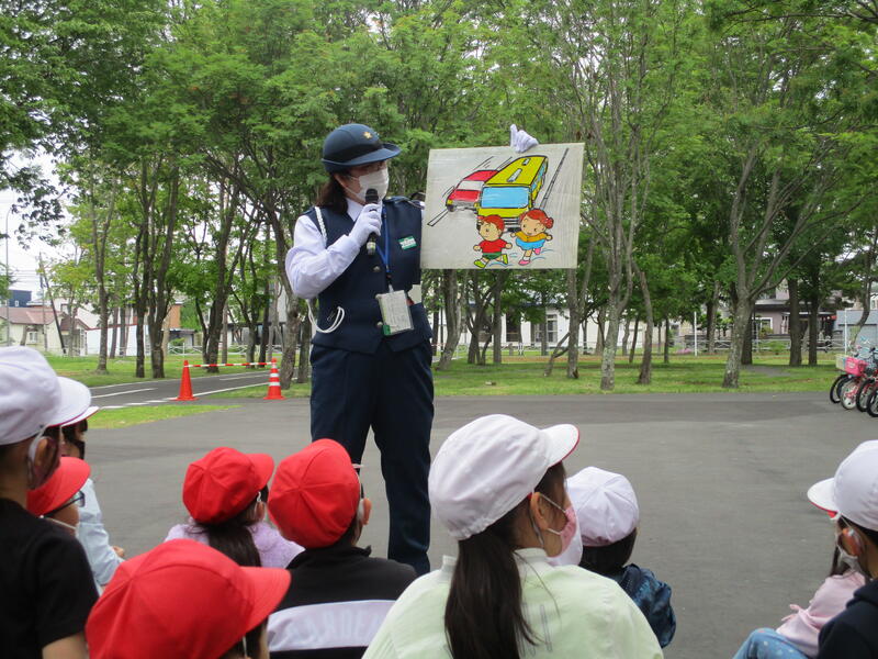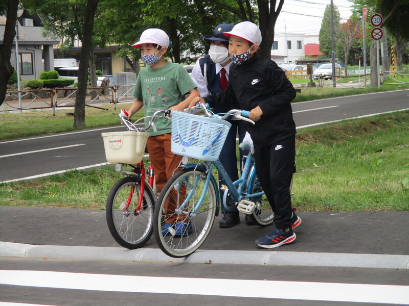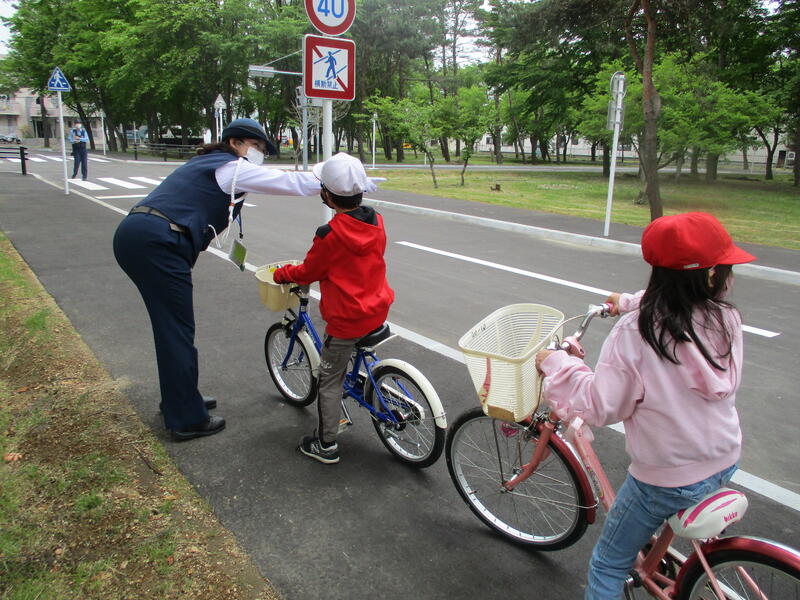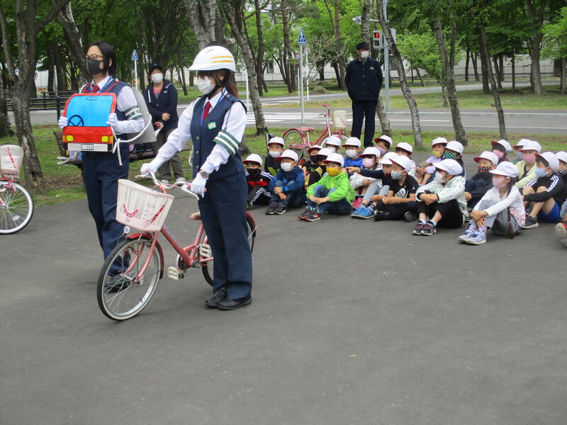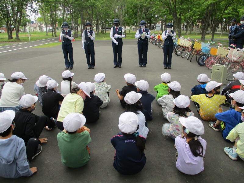 本日、2年生で交通安全教室を行いました。バスに乗って交通公園にいき、安全な自転車の乗り方について学習しました。千歳市交通安全教育指導員、千歳警察署の方々の丁寧な指導のもと、実際に自転車に乗って、ブレーキのかけ方、発進時の安全点検、信号機のある横断歩道の渡り方などを学びました。今日の学びを普段の生活に生かして、交通事故に遭わない自転車の乗り方をしてほしいと思います。