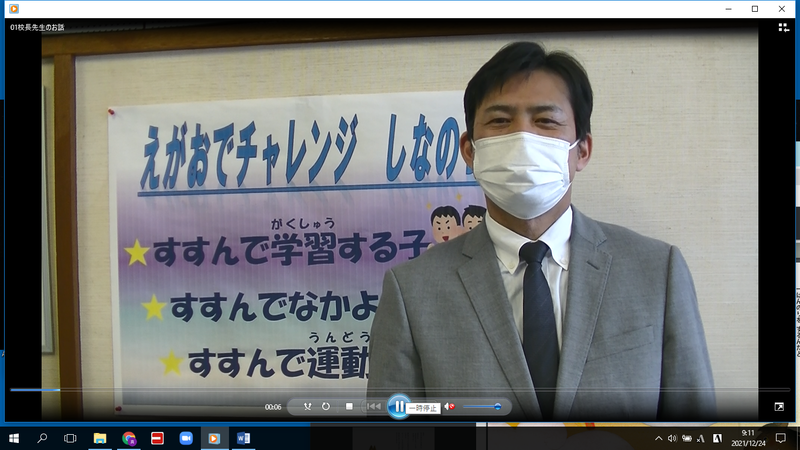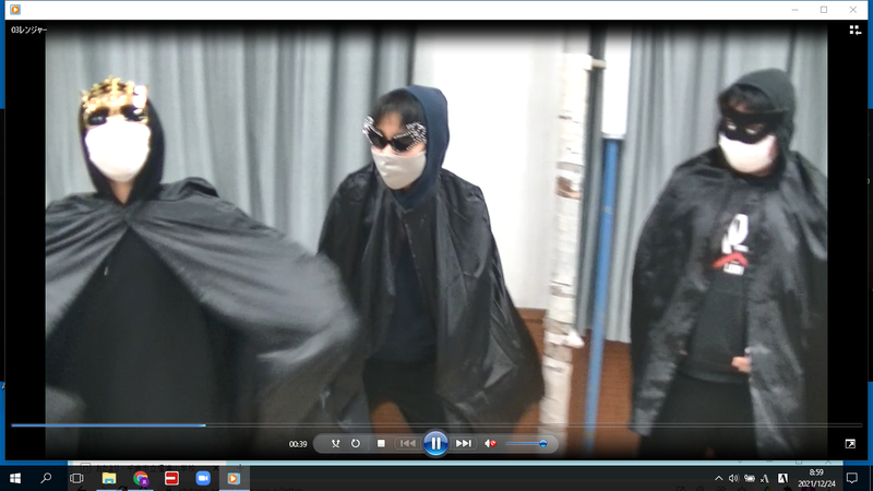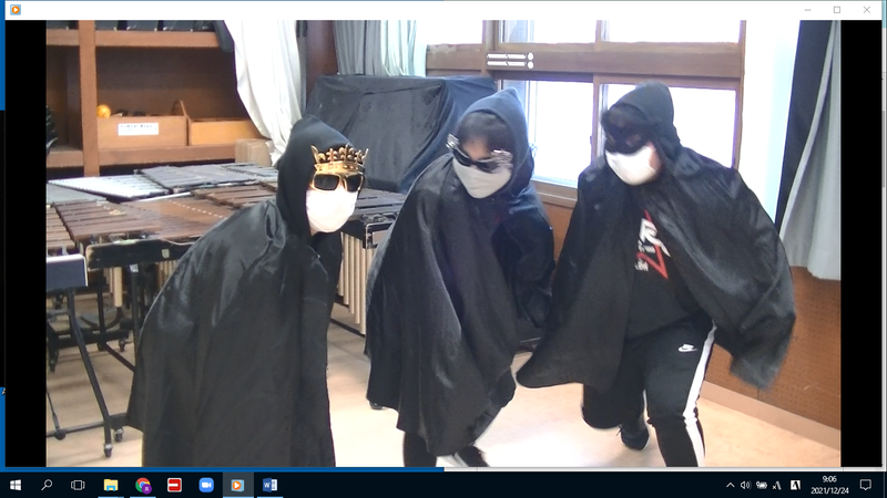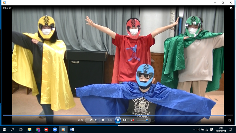 明日から冬休みが始まります。本日、テレビ放送で「冬休み集会」を行いました。全校のみんなに健康で安全で、楽しい冬休みを過ごしてもらうため、6年生の有志よる劇「しなレンジャー」が放送されました。不規則で危険な生活をするブラックが「しなビーム」をあびて退治されるというお話しです。
