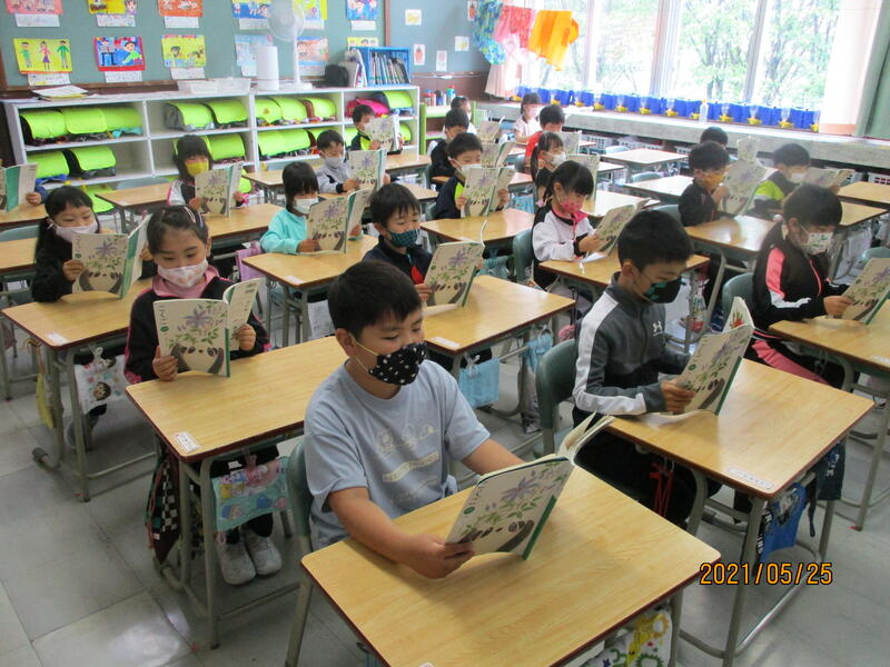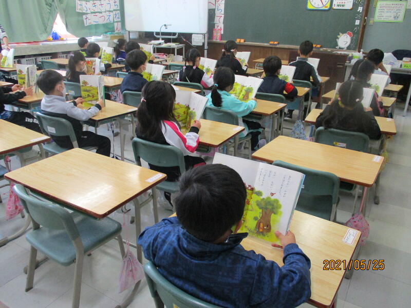 1年生が、国語の時間に教科書を音読していました。「はなのみち」というお話しです。教科書を机に立てて持ち、背筋を伸ばして音読していました。みんなの声もそろっていました。