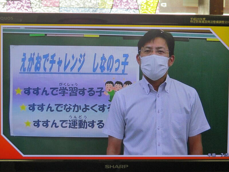 夏休みが終わり、子どもたちが元気に登校してきました。夏休みの作品や上靴を両手に抱え、「おはようございます」と元気な声を響かせていました。本日、テレビ放送で「夏休み明け集会」を行いました。