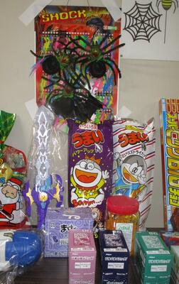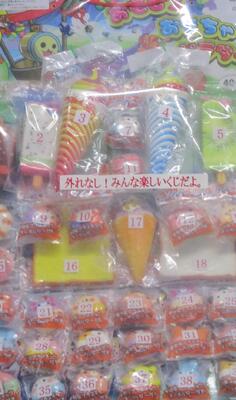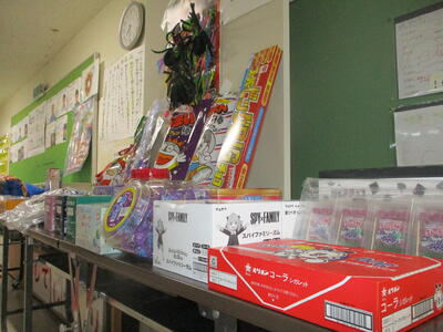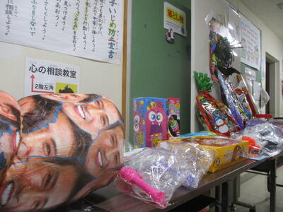 児童玄関前には、ふれあい祭り(くじ)の景品が“サプライズ展示”されていました。