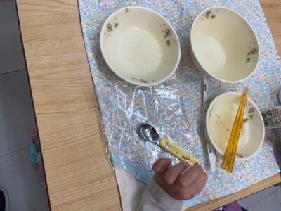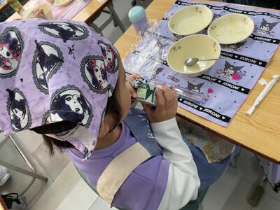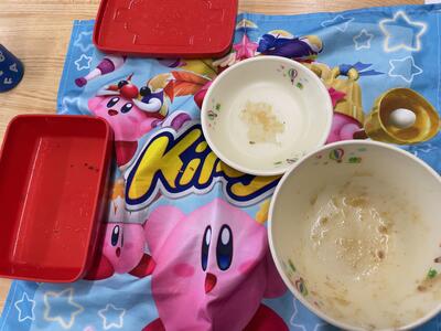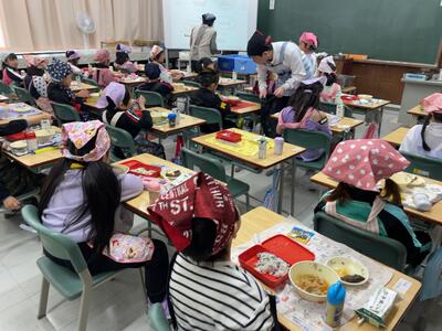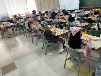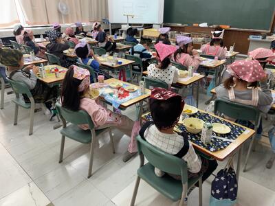 1年生、はじめての給食でした。今日のメニューは「マカロニスープ、鶏の照り焼きパティ、コーンソテー、角食パン」でした。「おいしーい」と、みんな笑顔で食していました。おかわりしたり、完食した1年生もいました。