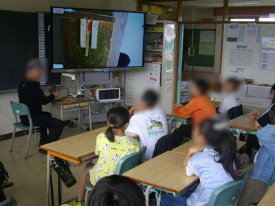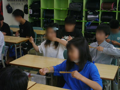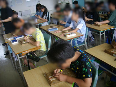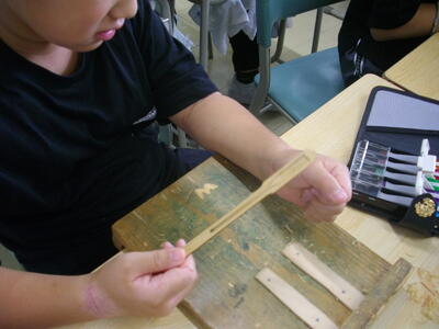 5年生のアイヌ文化学習の一環として、「イ パプケ ニ」(鹿呼び笛)を製作し、木彫り文様を施しました。数種類あるアイヌ文様の中から、魔よけの意味を持つ「アイウシ」を紙に描いて練習した後、板に下書きをしてから三角刀を使って彫りました。板に風を通すための厚紙を貼り付け、音の元になるテープを挟んで完成させました。はじめはなかなか出なかった音もテープの引っ張り方や位置を工夫すると教室のあちこちから音が出るようになりました。