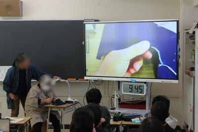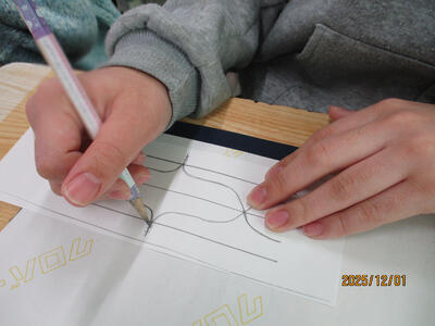 5年生のアイヌ文化学習の一環として、「イ パプケ ニ」(鹿呼び笛)を製作し、木彫り文様を施しました。数種類あるアイヌ文様の中から、魔よけの意味を持つ「アイウシ」を紙に描いて練習した後、板に下書きをしてから三角刀を使って彫りました。板に風を通すための厚紙を貼り付け、音の元になるテープを挟んで完成させました。はじめはなかなか出なかった音もテープの引っ張り方や位置を工夫すると教室のあちこちから音が出るようになりました。