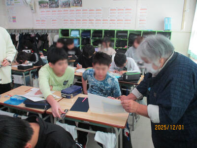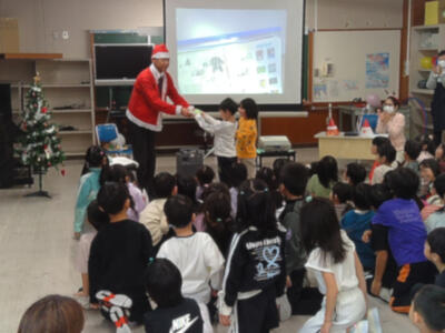 最後に、校長サンタから1年生の子どもたちに向けて、図書ボランティアさんが作ってくださった手作りのプレゼントが渡されました。子どもたちは一足早いクリスマスプレゼントにとても喜んでいました!
