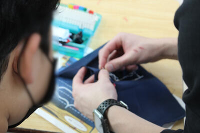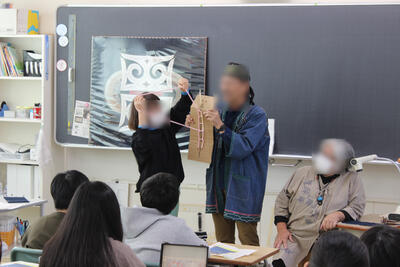 三日間にわたり、ゲストティーチャーをお招きしてアイヌ文様の刺繍縫い体験を実施しました。まずは文様の描き方を習い、次に布へ描き写す作業、そして最後に一針一針、丁寧に糸で縫い進める工程を教えていただきました。「アイウシ」と呼ばれるアイヌ文様の基本の一つを、「オホ」と呼ばれる縫い方で描きます。