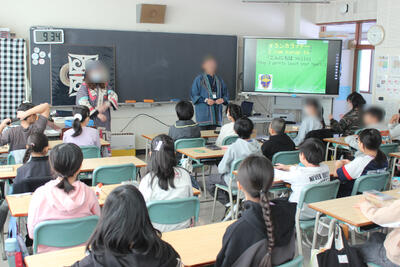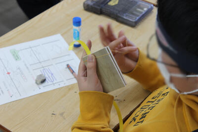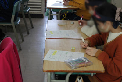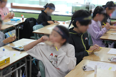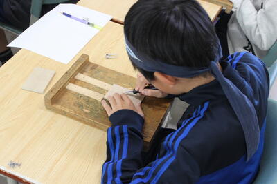 5年生のアイヌ文化学習の一環として、「イ パプケ ニ」(鹿呼び笛)を製作し、木彫り文様を施しました。数種類あるアイヌ文様の中から、魔よけの意味を持つ「アイウシ」を紙に描いて練習した後、板に下書きをしてから三角刀を使って彫りました。板に風を通すための厚紙を貼り付け、音の元になるテープを挟んで完成させました。はじめはなかなか出なかった音もテープの引っ張り方や位置を工夫すると教室のあちこちから音が出るようになりました。