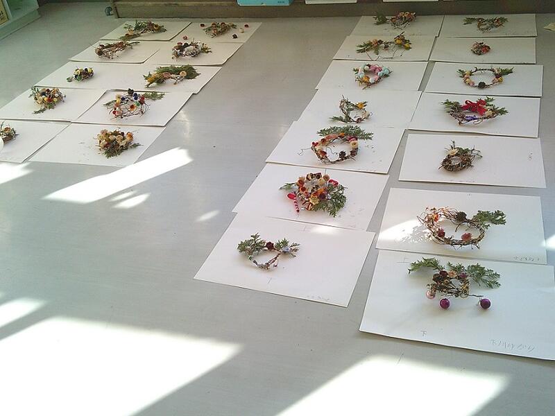 1年生が朝顔の弦や落ちていた葉を集めてクリスマスリースを作りました。作品の仕上げは、参観日にお家の方といっしょに飾り付をしながら完成させました。