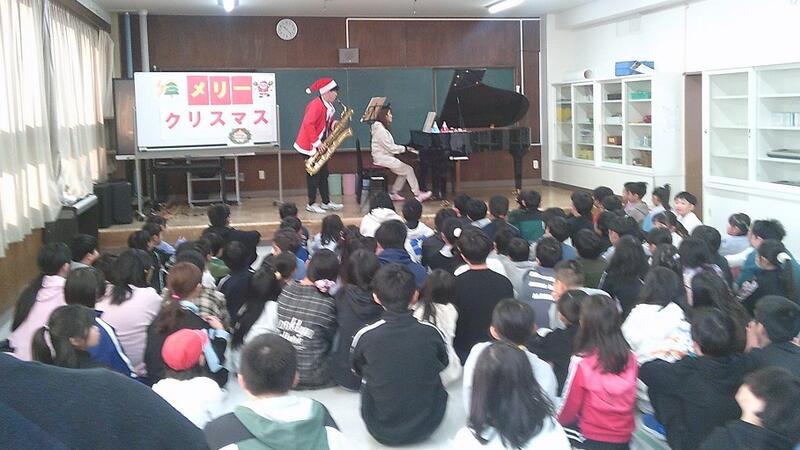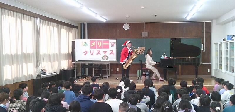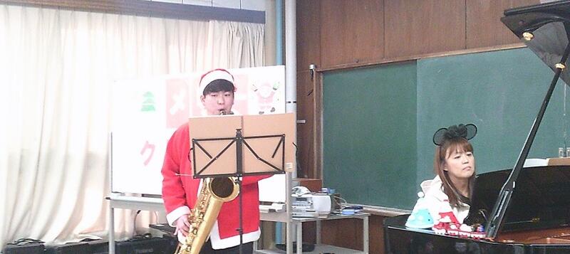 中休みに2名の先生によるピアノとサックスのコラボ演奏会を開催しました。クリスマスの雰囲気を音楽で味わってもらおうと、クリスマスやディズニーソングのメドレーを演奏しました。フリー参加でしたが、たくさんの児童が集まり、最後まで真剣に耳を傾けていました。サックスの響く音を初めて聴く児童が多く、ピアノとの優しさと迫力あるコラボ演奏はどの子も笑顔いっぱいの時間となりました。